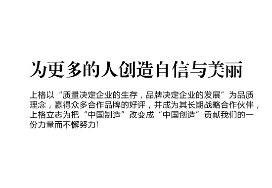 上格一路走來,以“締造時尚集團,使公司受人尊敬,令人向往;為客戶提升價值,創(chuàng)造成功;讓員工提高生活品質(zhì),實現(xiàn)自我價值”作為我們的目標(biāo),“為更多的創(chuàng)造自信與美麗” 作為我們的使命,立志為把“中國制造” 改變成“中國創(chuàng)造”貢獻我們的一份力量而不懈努力!